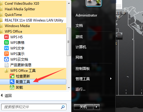 1、打开始菜单-所有程序中 Wps office-WPS Office工具-配置工具;